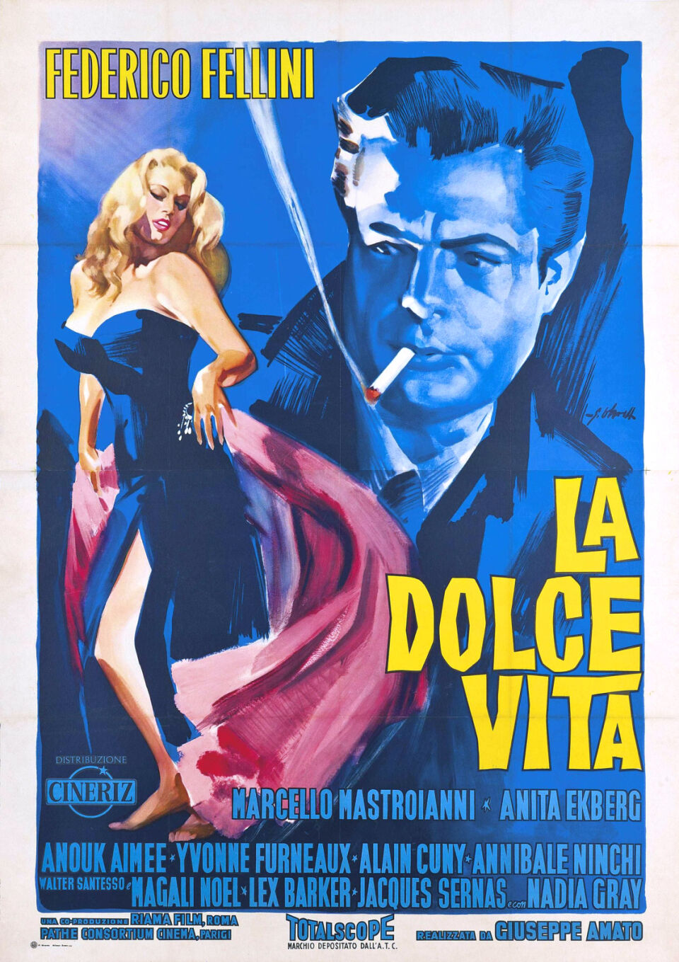 Obra maior de um dos cineastas italianos mais populares de todos os tempos, A Doce Vida é um retrato da cultura do estrelato, com um protagonista no encalço do sedutor estilo de vida das ricas e glamorosas celebridades que, em plena era da sociedade do espetáculo, se exibem em Roma. O mirone desse espetáculo mundano chama-se Marcello Rubini (Marcello Mastroianni) e, na qualidade de jornalista de mexericos, explora as periferias dos holofotes. A autenticidade do filme deve-se, em parte, ao “estudo” que Fellini dedicou, durante um verão inteiro, à vivência das estrelas, e, ainda, à dimensão autobiográfica da personagem de Marcello, evocação dos primeiros tempos de Fellini em Roma, onde começou por trabalhar como jornalista. Para sempre lembrado pela imagem icónica de Anita Ekberg na Fontana di Trevi, A Doce Vida é uma ode à cidade de Roma, mostrando-nos as suas fachadas opulentas e vibrantes para depois nos revelar a progressiva decadência no seu cerne.