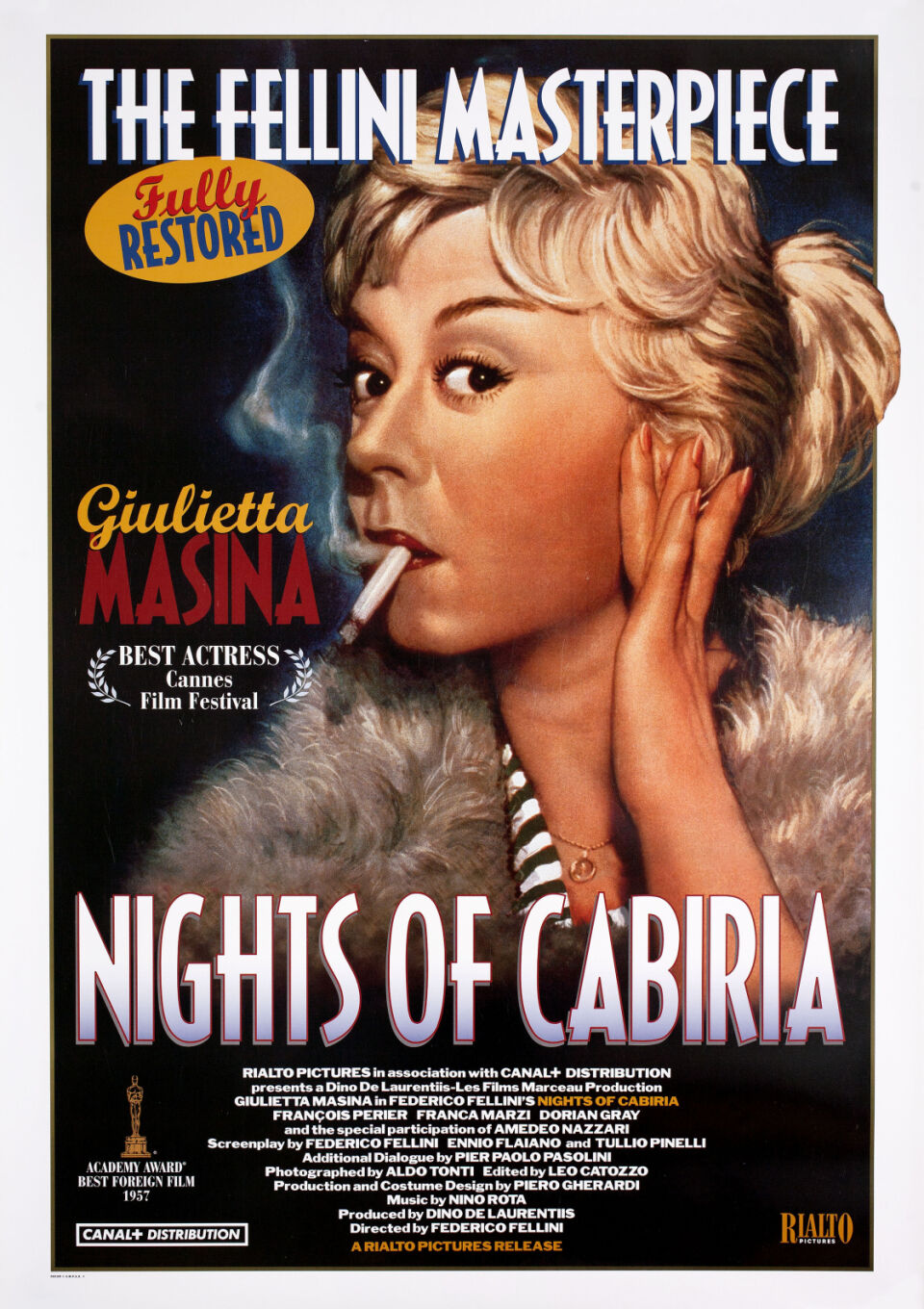 Cabíria (interpretada por Giulietta Masina, num papel comoventemente chapliniano) é uma jovem prostituta mergulhada no submundo de Roma. Apesar de uma vida marcada por desgostos e injustiças, Cabíria continua a acreditar no amor e na possibilidade de uma vida melhor. Um dia, conhece um homem aparentemente sincero disposto a casar-se. Uma “concretização” do neo-realismo, “superando-o numa reorganização poética do mundo” (André Bazin), e “talvez o mais belo de todos os filmes de Fellini”, segundo Manoel de Oliveira, As Noites de Cabíria revela-se uma profunda exploração da condição humana, entre o patético e o melodrama.