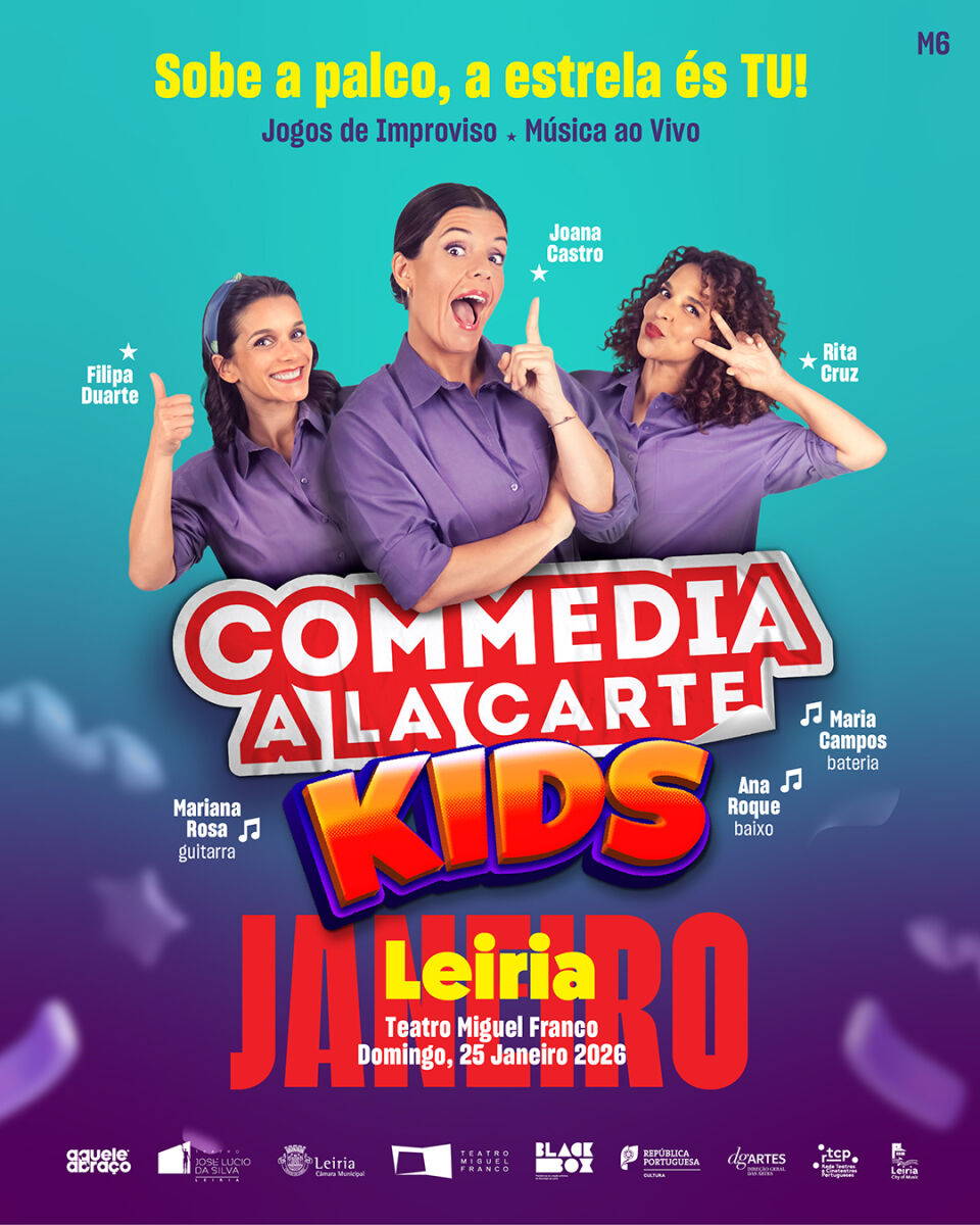 “Commedia a La Carte Kids”. Vem a palco improvisar connosco! Filipa Duarte, Joana Castro e Rita Cruz, acompanhadas de uma banda ao vivo, Mariana Rosa (guitarra), Maria Campos (bateria) e Ana Roque (baixo). Improvisando em jogos de palavras e em interações diretas com as crianças, que são chamadas a palco para intervir. Um espetáculo que promete diversão e garante entretenimento para miúdos e graúdos, sempre com a garantia Commedia a la Carte.