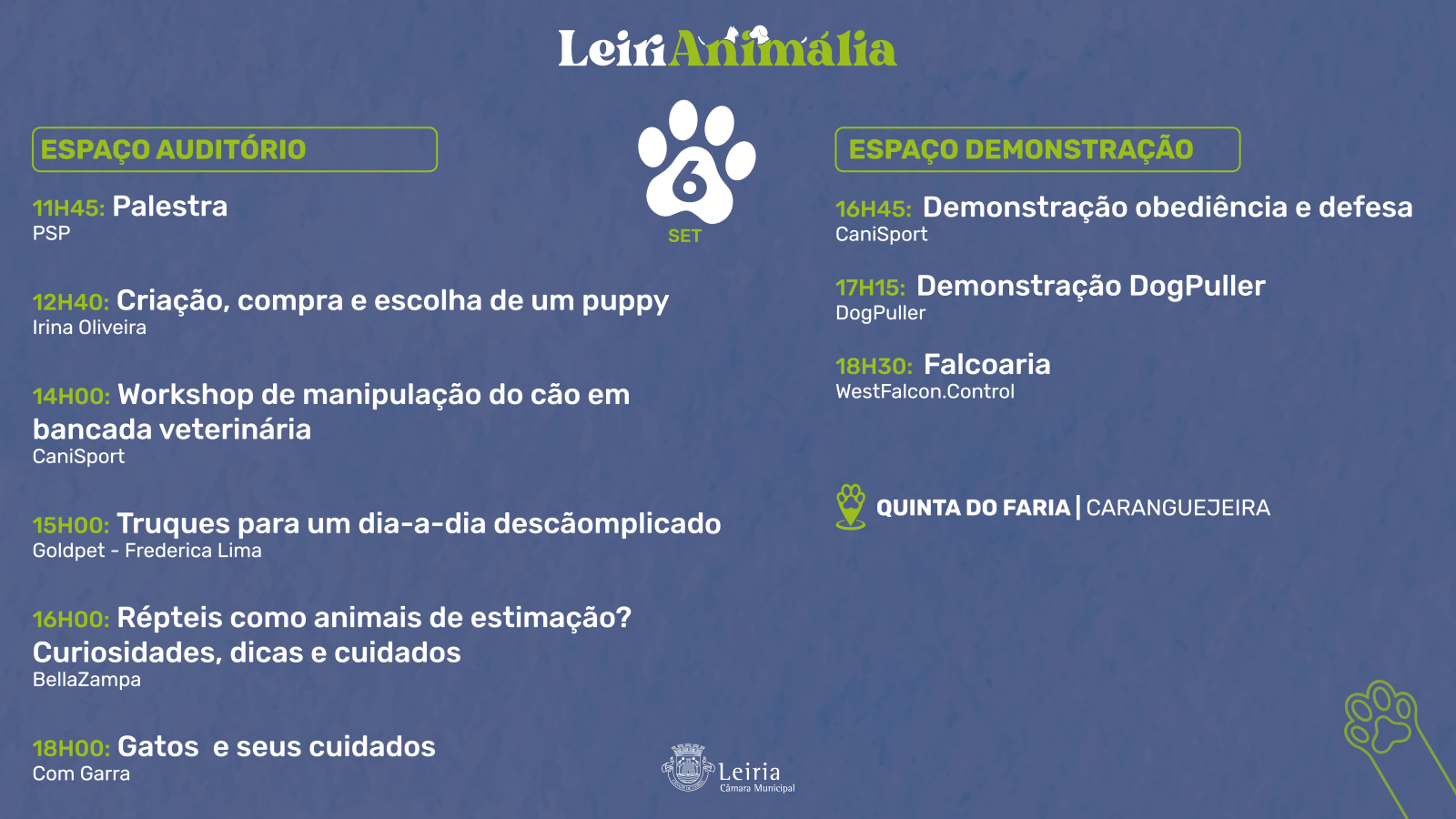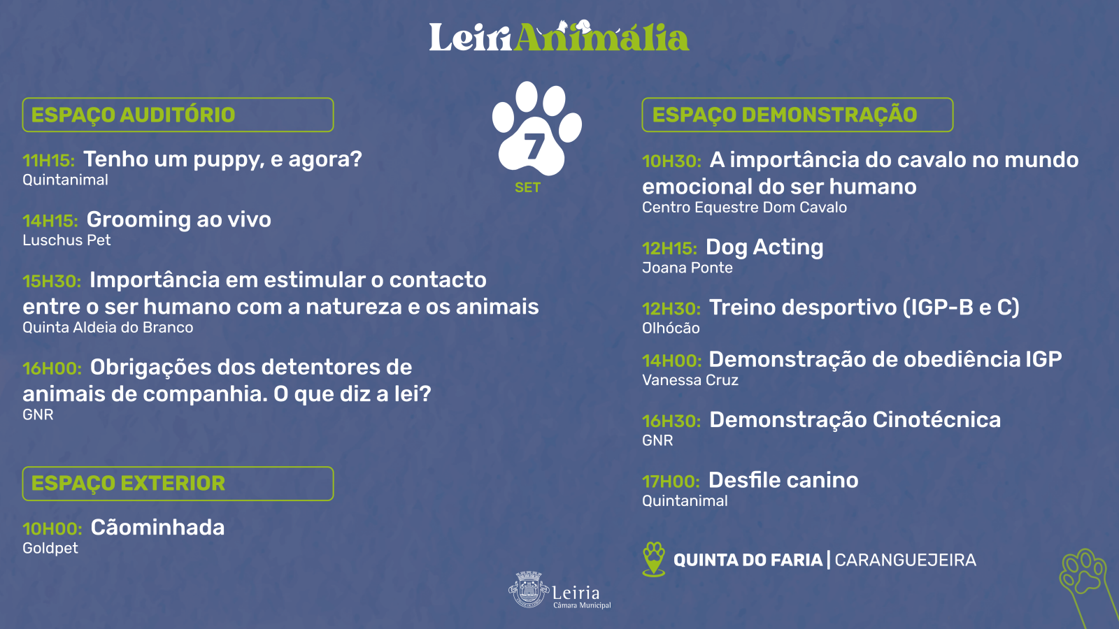 Nos dias 6 e 7 de setembro realiza-se, na Quinta do Faria, na Caranguejeira, 7.ª edição do LeiriAnimália. O evento decorre num espaço verde com mais de 60 mil metros quadrados e inclui várias atividades ligadas ao bem-estar animal.