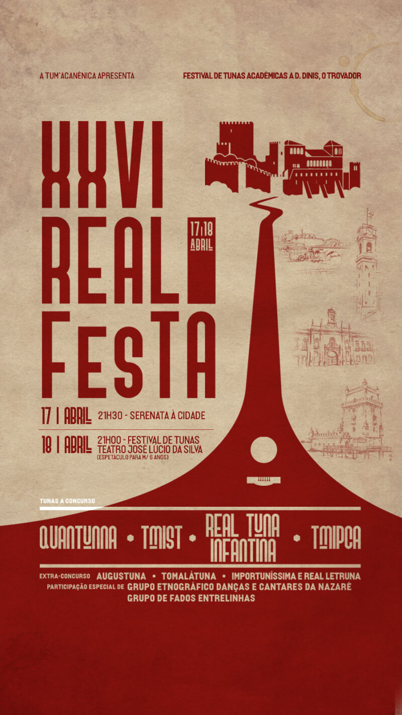 No dia 18 de abril, o Real FesTA, Real Festival da Tunas Académicas a D. Dinis, o Trovador regressa para a sua 26.ª edição, celebrando a riqueza cultural e musical de norte a sul do país. Sob o tema “Caminhos de Portugal”, esta edição convida a uma viagem única pelas tradições, sonoridades e identidades que dão vida às várias regiões portuguesas.